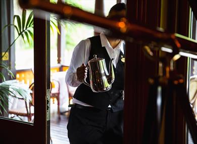 The restaurant is set in a timeless, classic style with white tablecloths and candlelight. The waiters wear white gloves and bow ties. The hotel has a dress code every evening, encouraging elegant attire. For guests without a dinner jacket, the hotel offers the option to borrow one.